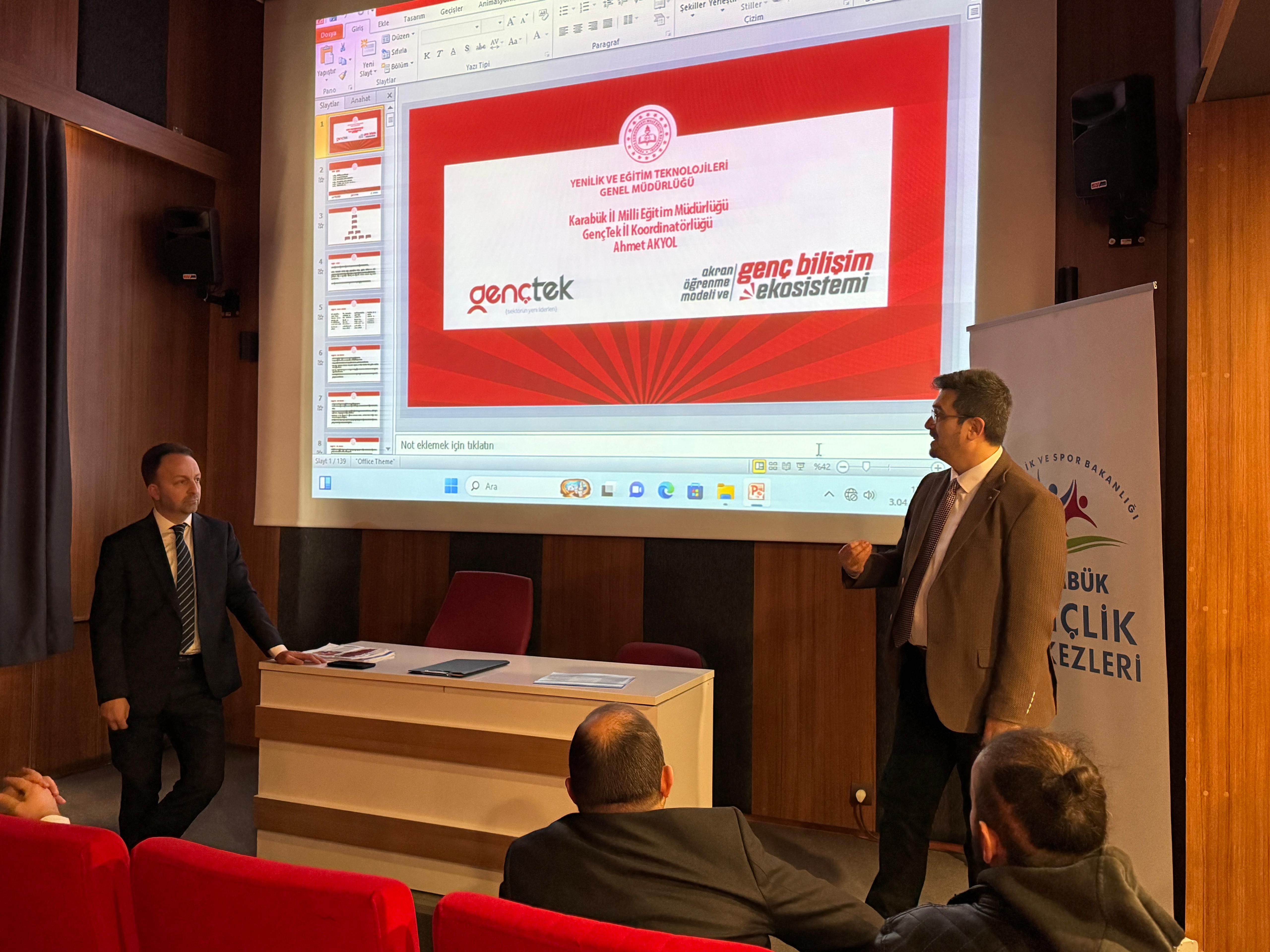 Karabük’te gençlere yönelik projelerin geliştirilmesi amacıyla, Karabük Gençlik Merkezi öncülüğünde bir toplantı düzenlendi. Toplantıya, Karabük Üniversitesi’ni temsilen Rektör Yardımcısı Prof. Dr. İsmail Rakıp Karaş, Bilgisayar ve Bilişim Bilimleri Fakültesi Dekanı Prof. Dr. İlker Türker, Bilişim Teknolojileri MYO Müdürü Dr. Öğr. Üyesi Emrullah Demiral, İl Millî Eğitim Şube Müdürü Metin Aktaş, GençTek Proje Koordinatörü Ahmet Akyol, Gençlik Hizmetleri Müdürü Hüseyin Bilicioğlu ve T3 Vakfı Karabük Sorumlusu Yelda Doğan ile akademisyenler ve Gençlik Merkezi personeli katılım sağladı.